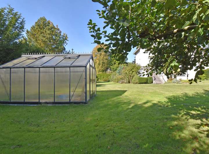 Eine weitläufige Rasenfläche, die umliegend mit diversen Sträuchern, Stauden, Hecken und Büschen eingefasst ist, bietet Kindern und Vierbeiner ein herrliches Eldorado zum Toben. Der Hobbygärtner erfreut sich währenddessen an dem hochwertigen Gewächshaus.