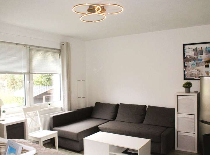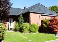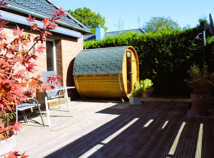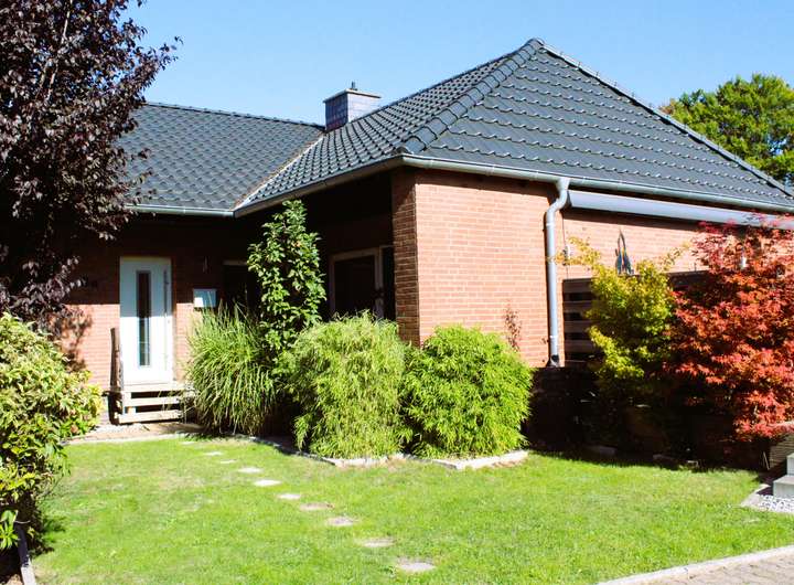 Der sonnige Garten mit seinen gemütlichen Terrassen lädt zum Entspannen ein. Ob als Familienheim oder als Rückzugsort für zwei – dieser Bungalow vereint Geborgenheit mit modernem Wohnen.