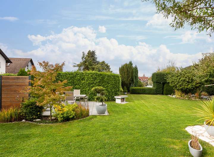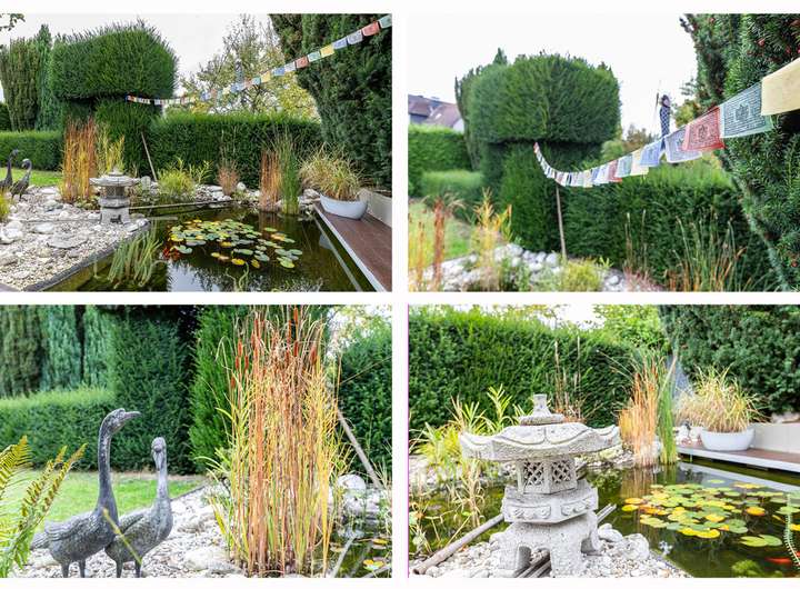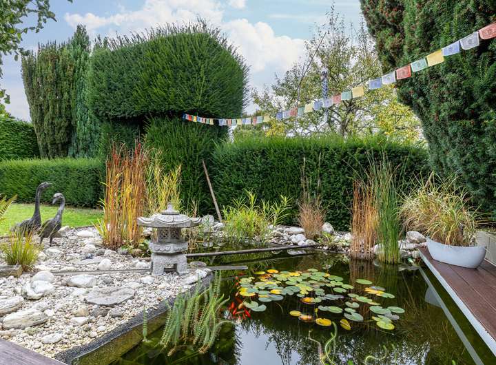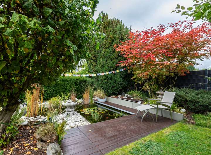 Besonderes Highlight ist die großzügige Gartenanlage mit asiatischen Bäumen und Sträuchern sowie einem Fischteich nebst Ruheplätzen zum Träumen.