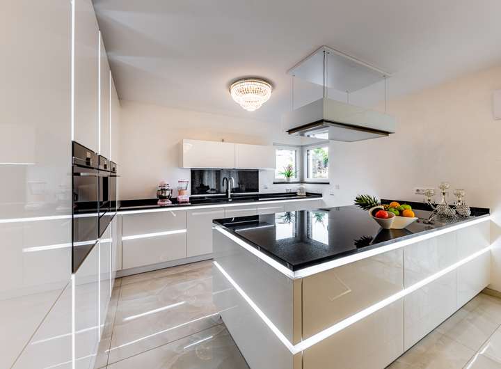 Eine offene Küche mit hochwertigen Marken-Einbauten und Geräten, sowie eine große Kochinsel mit absenkbarem, beleuchtetem Dunstabzug bilden zusammen mit dem großzügigen Wohn-/Essbereich den Mittelpunkt im Erdgeschoss. Von hier geht und blickt man in den gepflegten Garten mit seiner in anthrazit gefliesten Terrasse, wo man in der Sitzlounge dem Gesang der Vögel lauschen kann.
