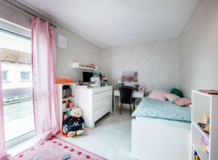 Das Obergeschoss verfügt über drei helle Kinderzimmer und ein exklusiv ausgestattetes Bad mit Doppelwaschtisch, Whirlpoolwanne und bodengleicher XL-Rainshower Dusche. Das Kinderzimmer für das älteste Kind hat zusätzlich einen schönen Balkon mit Edelstahl-Brüstung und satiniertem Glas.
