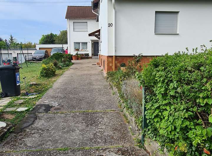 Das Vorderhaus hat rechts und links der Zufahrt gepflegte GRÜNSTREIFEN mit gepflanzten Hecken. Die Zufahrt zu den Häusern ist betoniert.