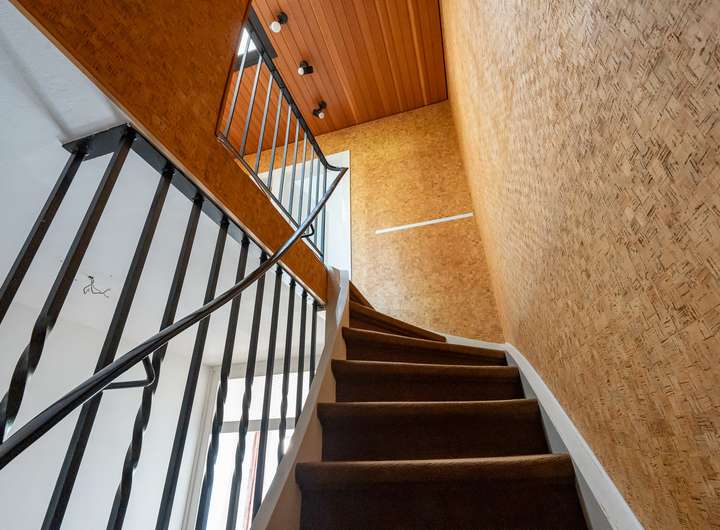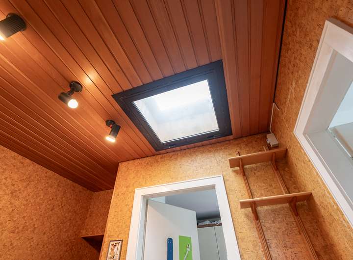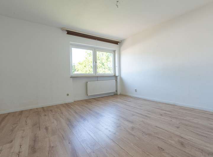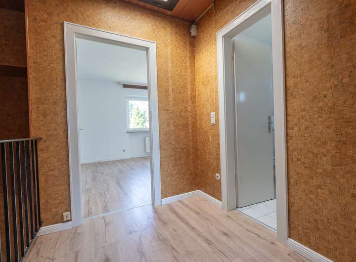 Das Obergeschoss beherbergt ein großes und ein kleines Kinder- oder Arbeitszimmer sowie ein geräumiges Schlafzimmer. Ein helles Duschbad mit Fenster und ein Oberlicht im Flur sorgen für eine angenehme Atmosphäre. Eine Holzwangentreppe mit Teppichfußboden verbindet das Erd- und Obergeschoss.