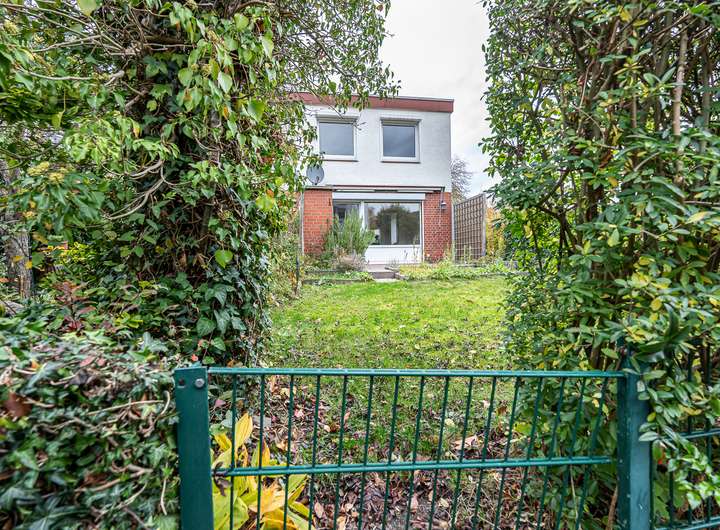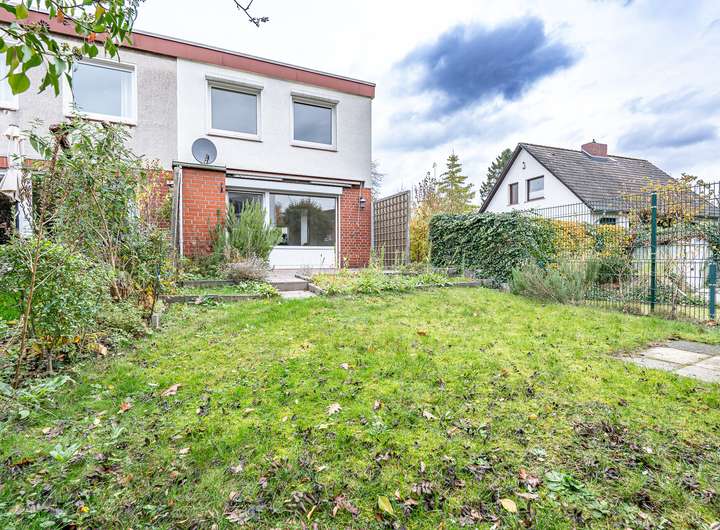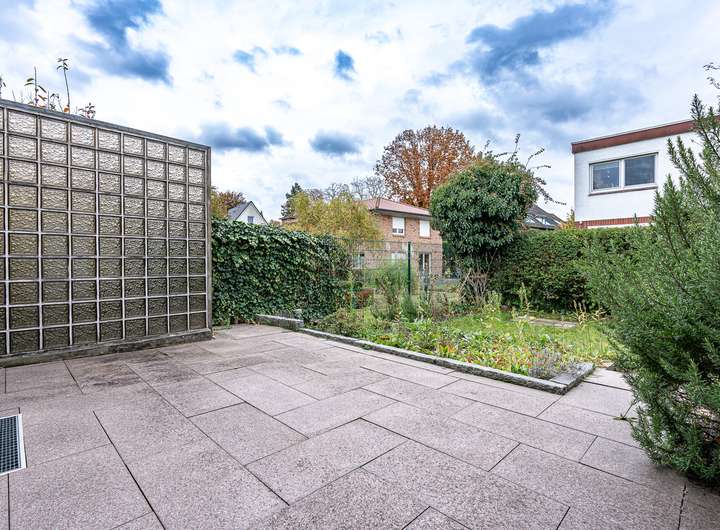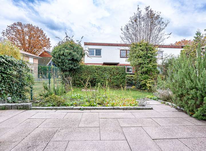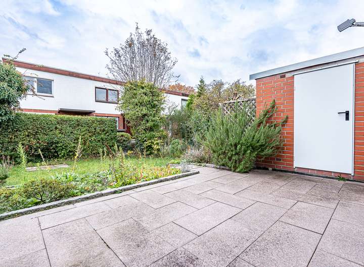 Das real geteilte Grundstück von 184 m² ist nach Süden ausgerichtet und verfügt über eine große Terrasse mit massivem Abstellraum, einen Garten mit Rasenfläche sowie einen Fahrradunterstand, ein Gerätehaus und einen PKW-Stellplatz.