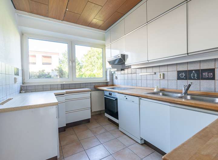 Der Wohnbereich besticht durch Eichenparkett, während das offen gestaltete Esszimmer mit Stäbchenparkett ausgestattet ist. Die hochwertige Einbauküche der Marke Leicht ist ebenfalls offen gestaltet und bietet direkten Zugang zum Flur. Ein Gäste-WC ergänzt das Raumangebot im Erdgeschoss.
