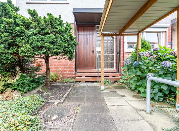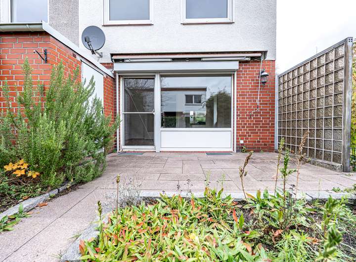 Der Außenbereich des Hauses ist ebenso ansprechend gestaltet. Eine große Terrasse mit Markise und massivem Nebengebäude lädt zum Verweilen ein. Der nach Süden ausgerichtete Garten ist eingefriedet und verfügt über eine Rasenfläche sowie eine Pforte zur Zuwegung. Ein Gerätehaus an der Hauswand und ein Fahrradunterstand vor dem Objekt bieten zusätzlichen Stauraum. Ein PKW-Außenstellplatz rundet das Angebot ab.