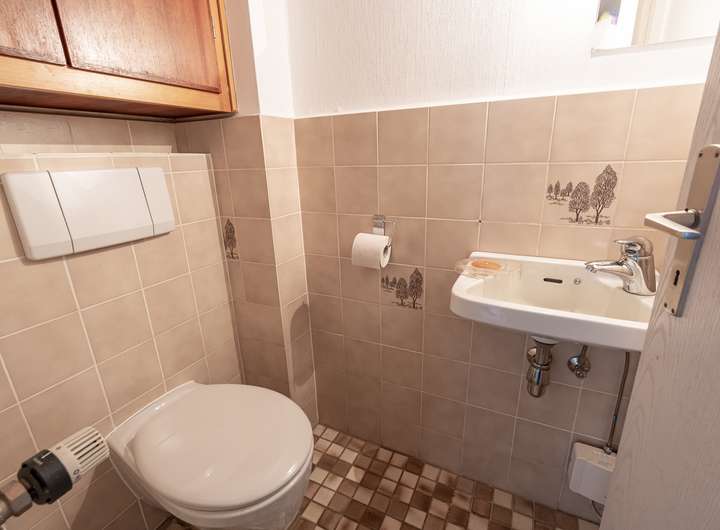Der Vollkeller des Hauses bietet eine Raumhöhe von ca. 2,10 m und umfasst verschiedene praktische Räume. Ein großer Hobbyraum mit Heizkörper und Einbauschränken, ein Vorratsraum unter der Treppe, ein Tresor, eine Waschküche mit Sockel für Waschmaschine und Trockner sowie ein Heizungsraum mit Abstellfläche stehen zur Verfügung. Der Kellerniedergang ist ansprechend mit Klinkerriemchen verkleidet.