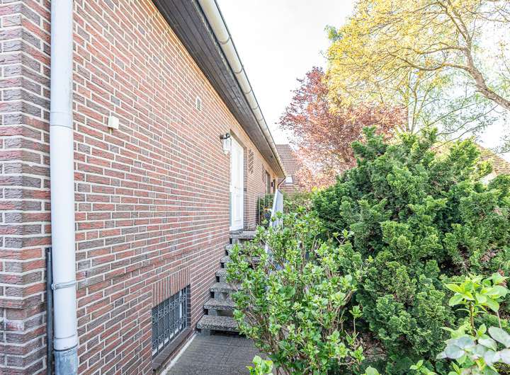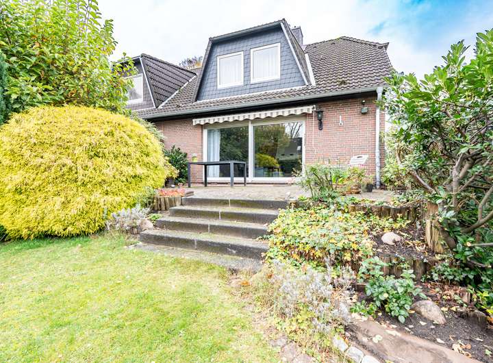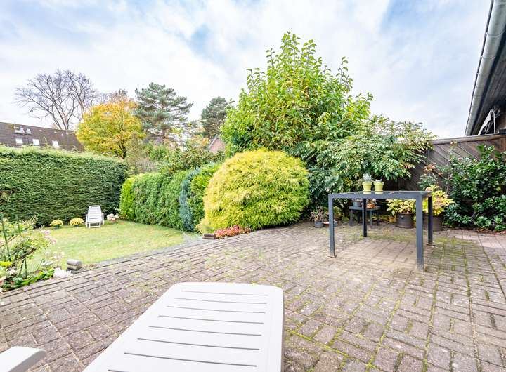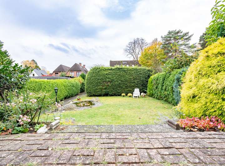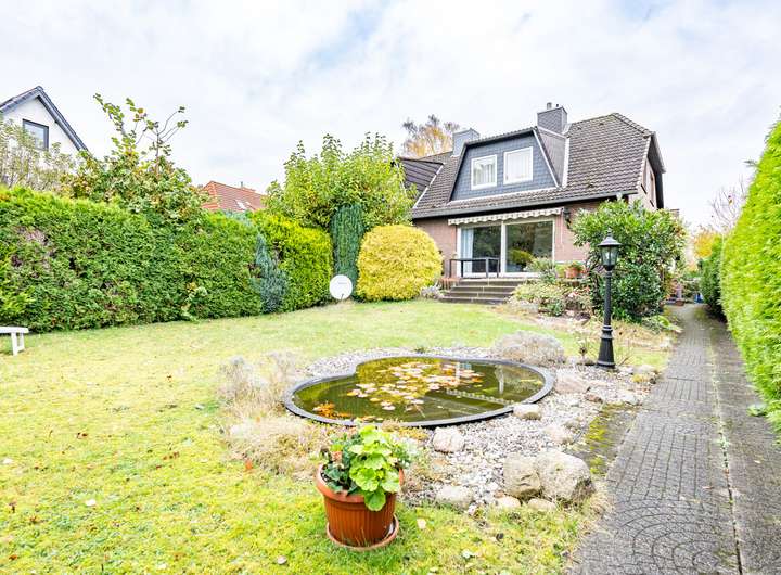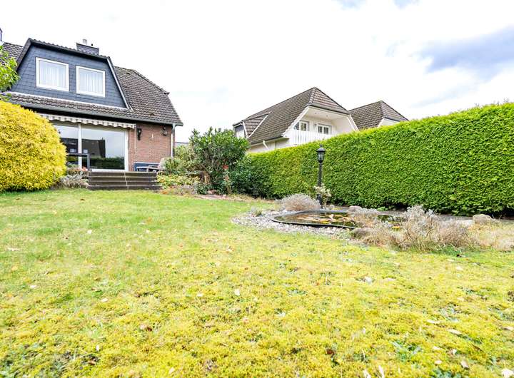 Der Außenbereich überzeugt mit einer großen Terrasse samt Markise, einem Gartenhaus und einem gepflegten Garten mit Teich sowie eine Garage mit Nebeneingang. Zusätzlich kann durch die Umsetzung des Gartenhauses ein zweiter PKW-Stellplatz auf dem Grundstück geschaffen werden.