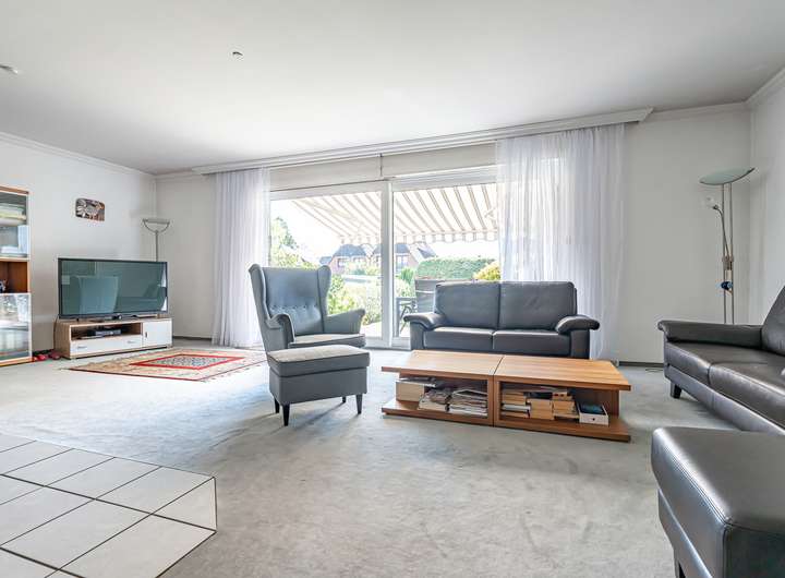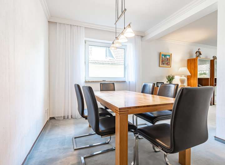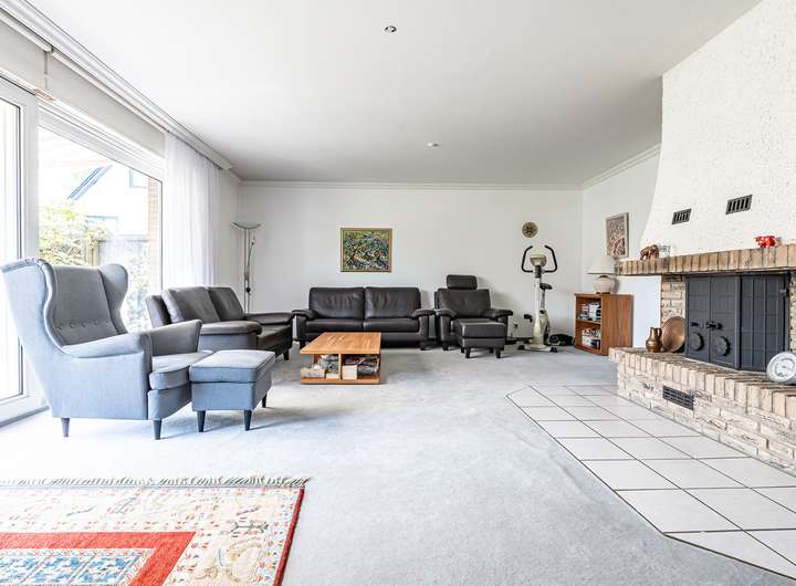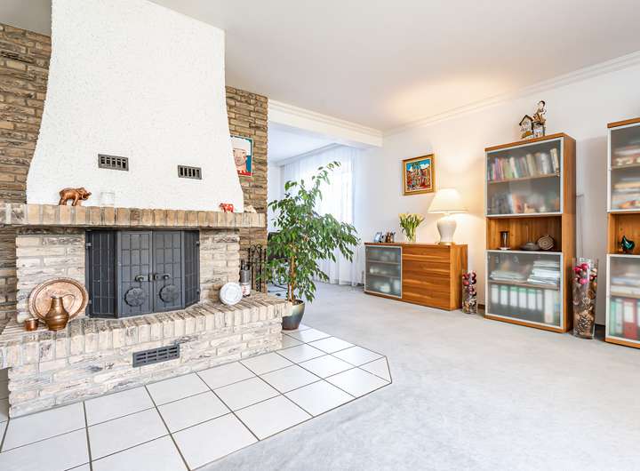 Das Herzstück des Erdgeschosses ist der lichtdurchflutete, offen gestaltete Wohn- und Essbereich mit ca. 51 m² Fläche. Hier sorgt ein gemauerter Kamin für gemütliche Stunden an kalten Tagen. Stuckleisten und ein großes Panoramafenster unterstreichen das angenehme Wohnambiente. Eine Schiebetür führt direkt auf die große, teils überdachte Terrasse mit Markise – ein idealer Ort zum Entspannen, Grillen oder für gesellige Stunden mit Familie und Freunden.