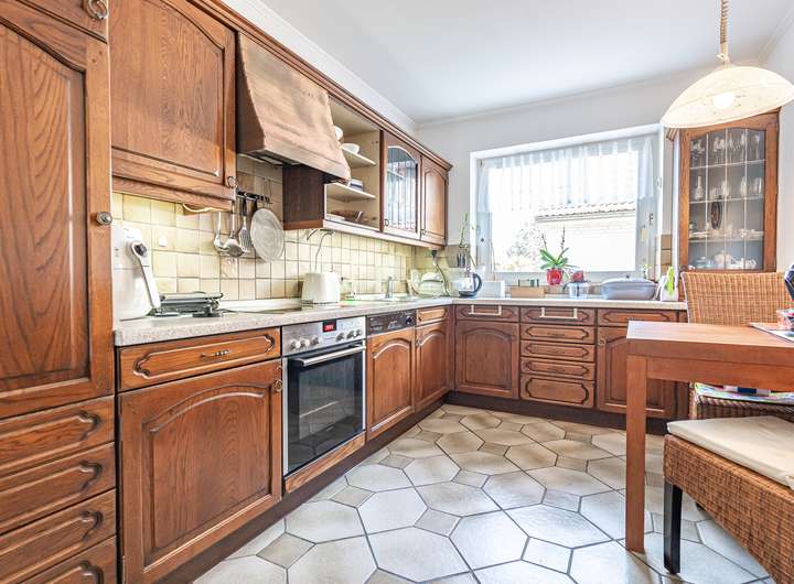 Die angrenzende Küche ist mit einer hochwertigen Einbauküche mit Massivholzfronten ausgestattet und bietet ausreichend Platz für einen kleinen Essbereich. Besonders praktisch: Die Wand zum Wohnbereich kann auf Wunsch geöffnet werden, sodass ein moderner, offener Küchen-/Essbereich entstehen kann.