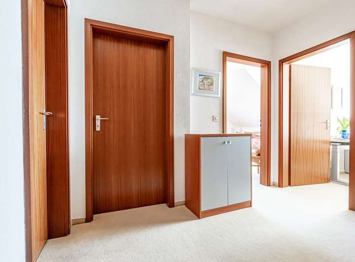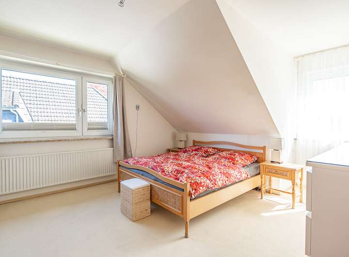 Über eine stilvolle Holztreppe erreichen Sie das Obergeschoss, das mit einem durchdachten Grundriss überzeugt. Der zentrale Dielenbereich ist quadratisch geschnitten und bietet Zugang zu allen Räumen. Das große Schlafzimmer ist hell und freundlich gestaltet, zwei weitere geräumige Zimmer eignen sich ideal als Kinder-, Arbeits- oder Gästezimmer.