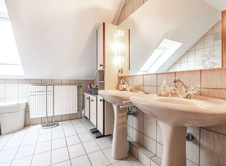 Das modern geschnittene Tageslichtbad bietet ausreichend Platz und Komfort für die ganze Familie: Zwei Waschtische, eine Badewanne, eine separate Dusche sowie ein Fenster sorgen für Helligkeit und Funktionalität.