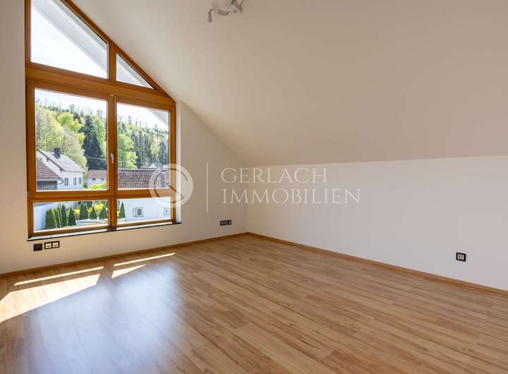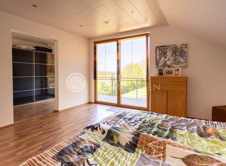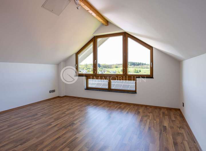 Im Dachgeschoss warten lichtdurchflutete Zimmer, eine Galerie mit Pellet-Ofen und der private Elternbereich mit Ankleide und Balkon – ein Ort zum Durchatmen und Abschalten.