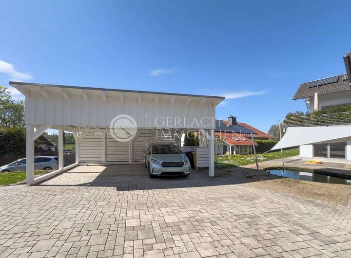 Mehrere überdachte Stellplätze und Garagen mit E-Ladestationen runden das Angebot ab.
