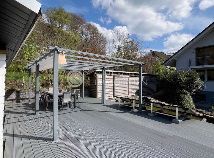 Auch der Außenbereich überzeugt mit mehreren Terrassen, einem gepflegten Garten und einem großen Gartenhaus mit Photovoltaikanlage und Speicher. Hier ist Platz zum Genießen, Spielen, Arbeiten oder einfach zum Innehalten.