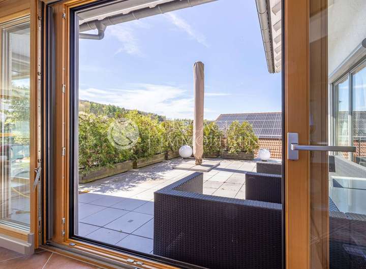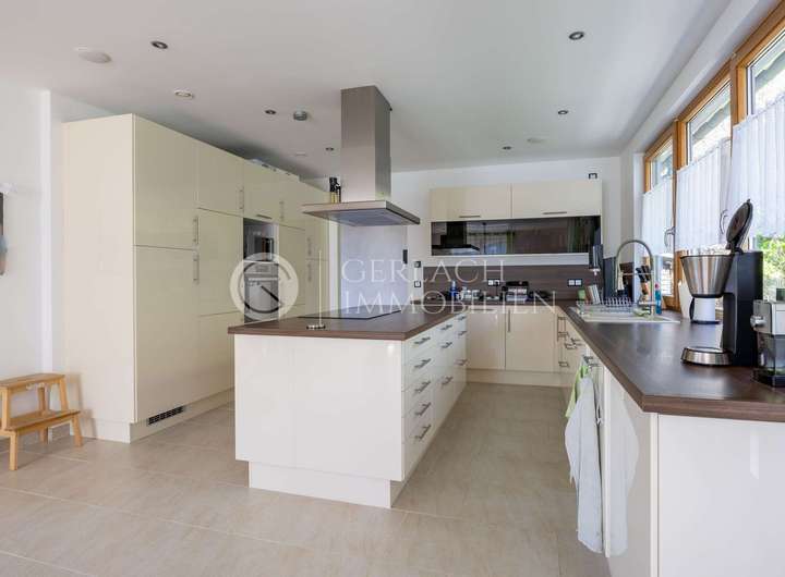 Die beiden Einheiten des Hauses – nach dem Wohnungseigentumsgesetz getrennt – machen es so besonders: Die Hauptwohnung ist großzügig, offen und hell. Bodentiefe Fenster holen die Natur hinein, der Kamin spendet Wärme, und die offene Küche mit Kochinsel wird schnell zum Mittelpunkt des Familienlebens. Auf den Terrassen, die sich ringsum anschließen, genießt man Sonne, Weitblick und die Ruhe des Ortes.