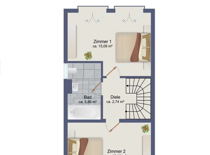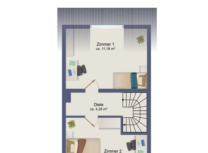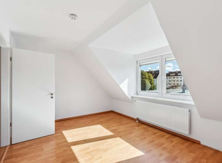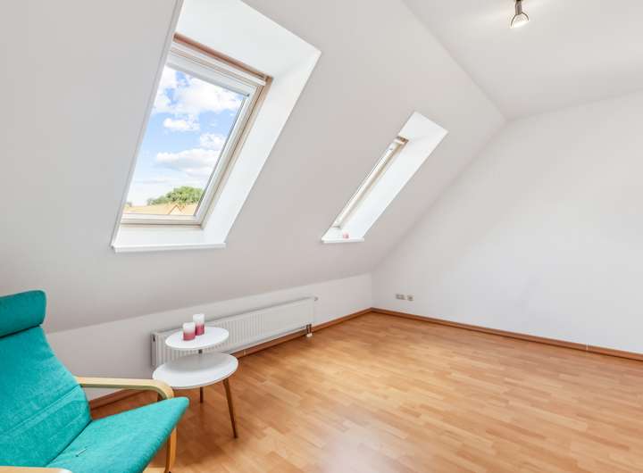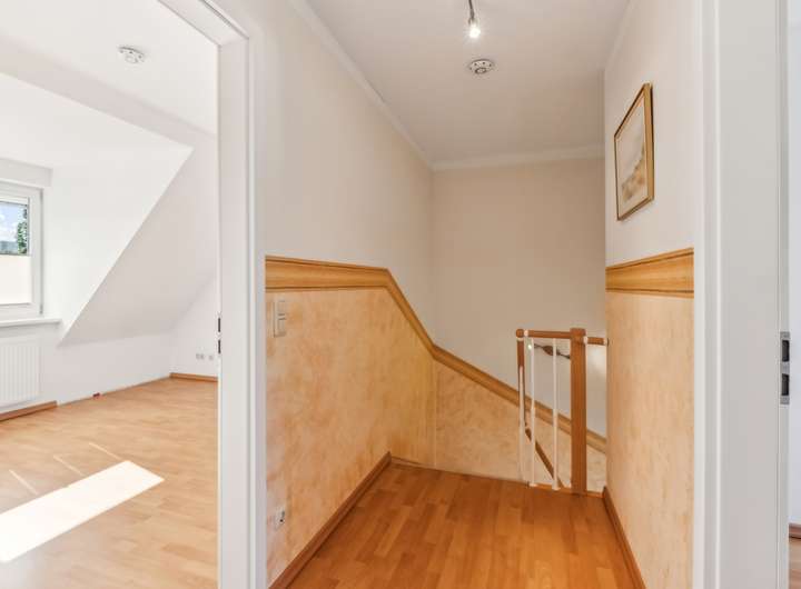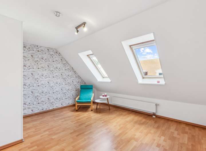 Im Dachgeschoss erwarten Sie schließlich zwei weitere Zimmer. Auf der rechten Seite befindet sich ein großzügiges Schlafzimmer mit Fenstern, auf der linken Seite ein weiteres helles Zimmer, das ebenfalls vielseitig genutzt werden kann.