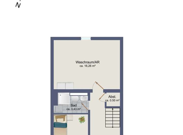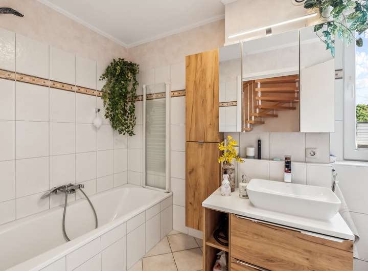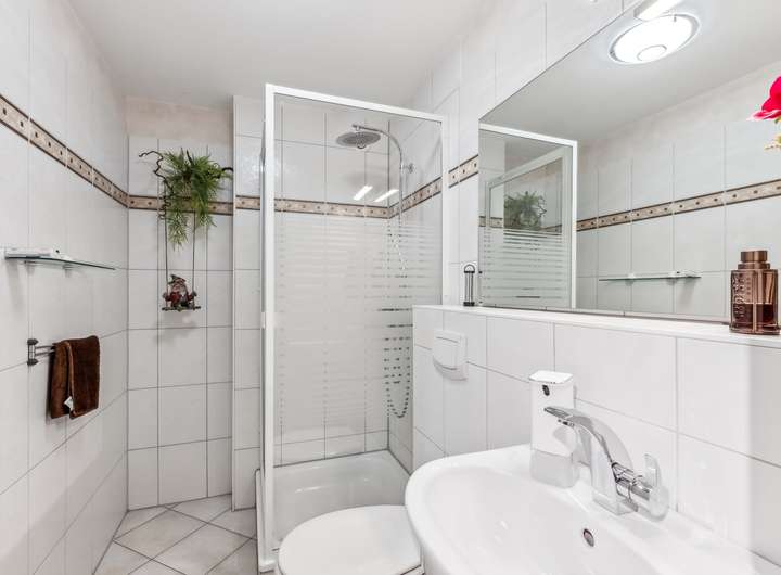 Folgen Sie dem Flur, gelangen Sie zu einem modernen Badezimmer, das mit seinen hellen Fliesen und einer gepflegten Ausstattung überzeugt. Es verfügt über eine Dusche, ein Waschbecken sowie eine Toilette. Am Ende des Flurs befindet sich ein weiteres Zimmer, das aktuell als Wäsche- / Lagerraum genutzt wird.