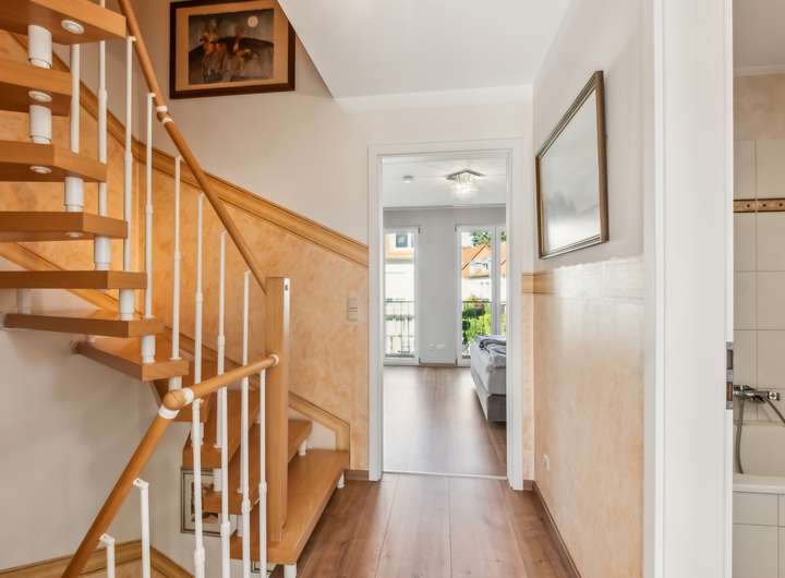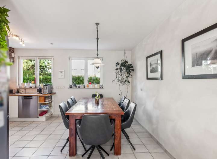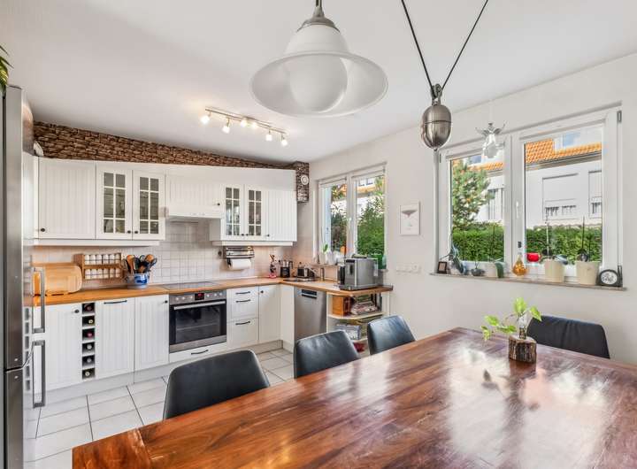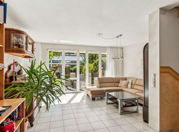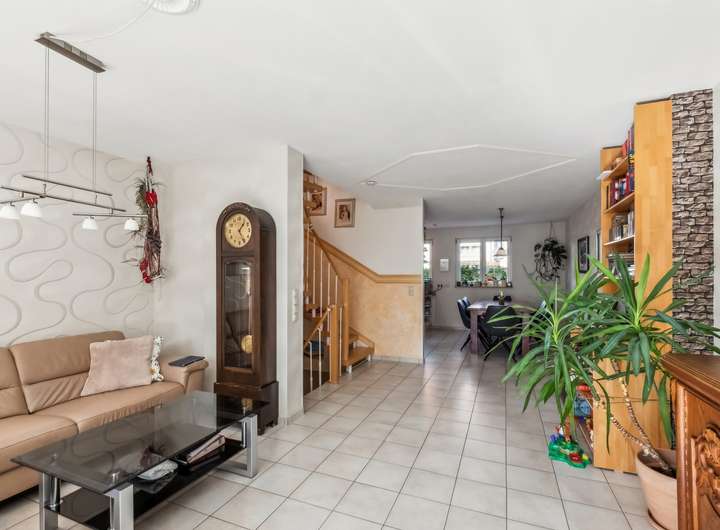 Über die Treppe erreichen Sie das erste Obergeschoss. Hier erwartet Sie der offen gestaltete Wohn- und Essbereich. Auf der linken Seite befinden sich die Küche und der Essbereich, während sich zur rechten Seite das gemütliche Wohnzimmer anschließt. Große Fensterflächen durchfluten die Räume mit Tageslicht und schaffen eine freundliche, helle Atmosphäre. Vom Wohnzimmer aus gelangen Sie direkt auf die große Terrasse und in den liebevoll angelegten Garten – ein idealer Ort zum Entspannen und Genießen.