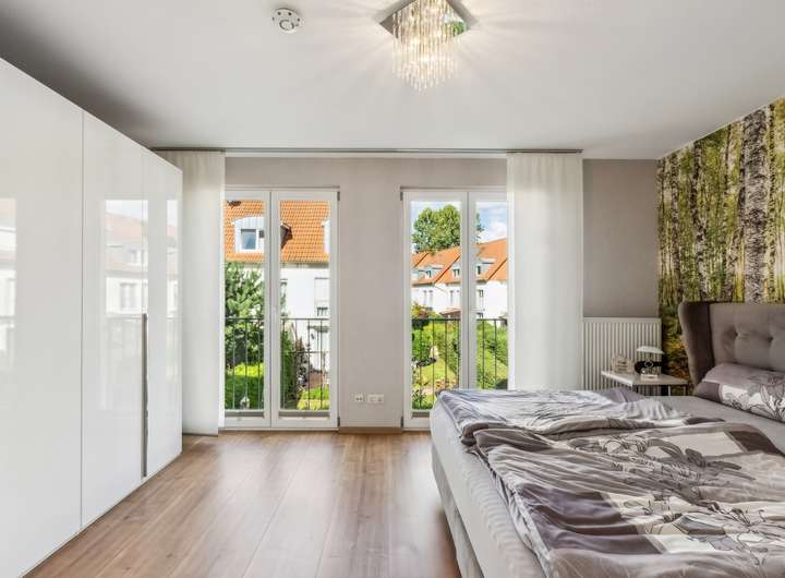 Im zweiten Obergeschoss befindet sich ein weiteres Badezimmer, ausgestattet mit Badewanne, Waschbecken und Toilette. Auch dieses Badezimmer verfügt über ein Fenster, das für angenehmes Tageslicht sorgt. Zur linken Seite liegt ein Schlafzimmer mit bodentiefen Fenstern, gegenüber befindet sich ein weiteres Zimmer mit ebenfalls bodentiefen Fenstern, das sich flexibel als Schlaf-, Gäste- oder als Kinderzimmer nutzen lässt.