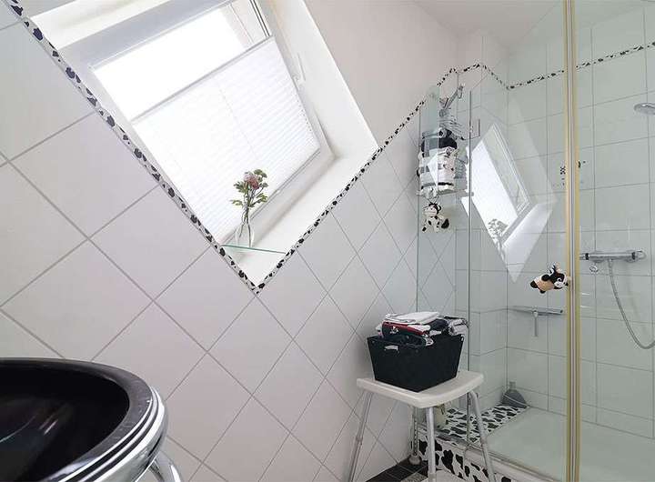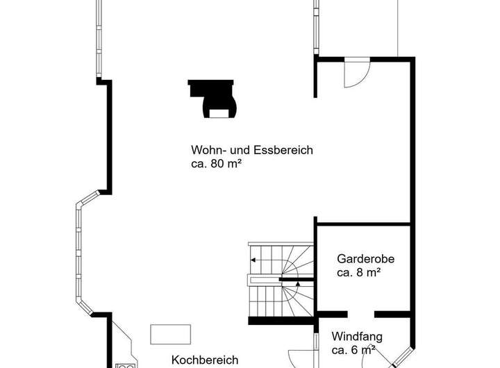 Das Erdgeschoss ist geprägt von einem offenen Grundriss. Vom Windfang mit angrenzender Garderobe öffnet sich der Zugang zum weitläufigen Wohn-, Ess- und Kochbereich. Ein stilvoller Kamin sorgt für eine besondere Atmosphäre. Ein modernes Gäste-WC mit Duschkabine ergänzt das Raumangebot auf dieser Ebene.