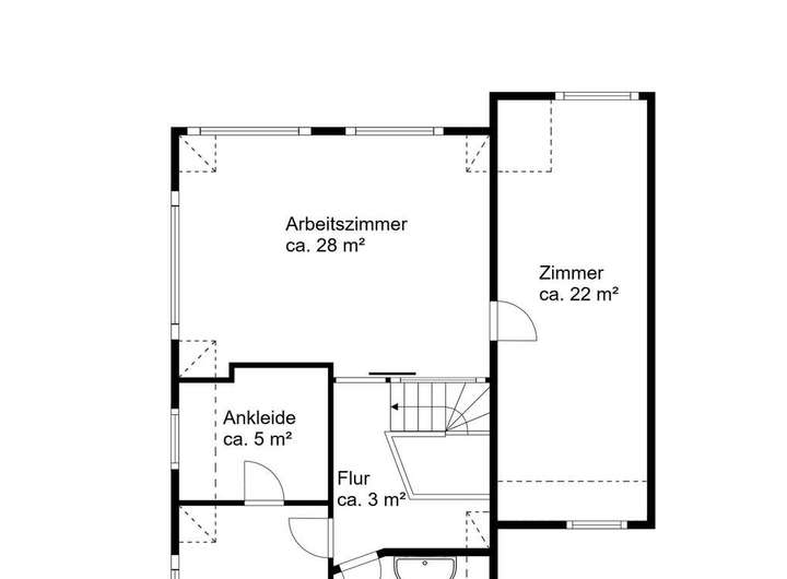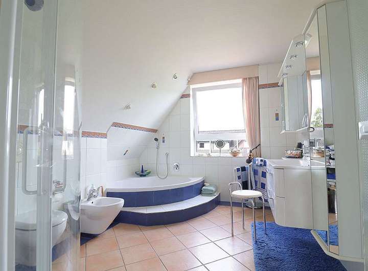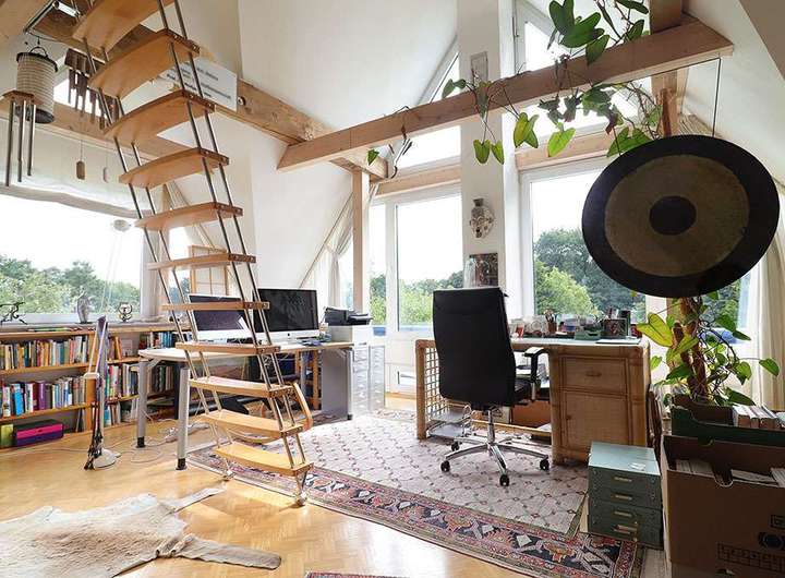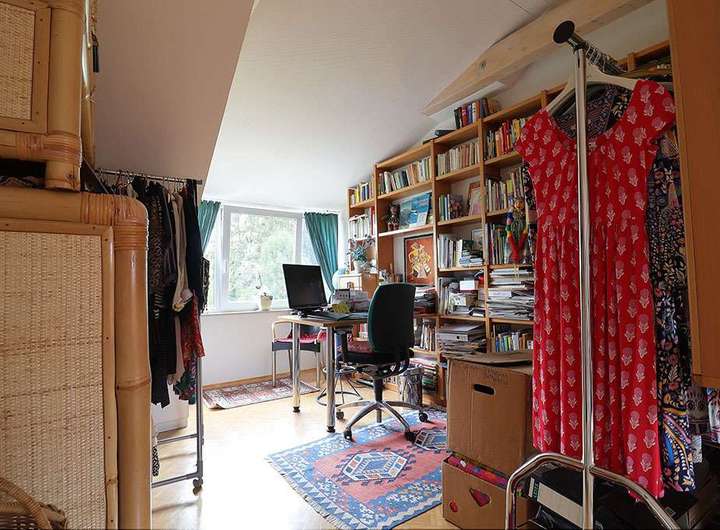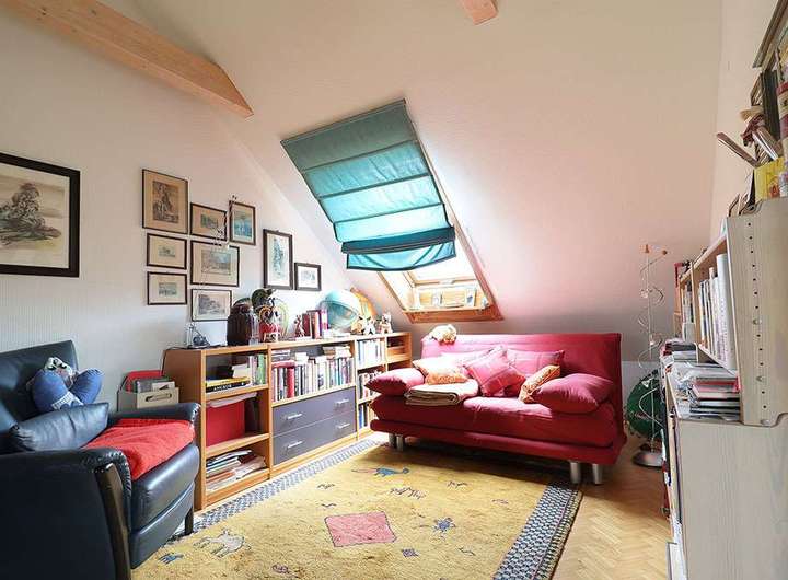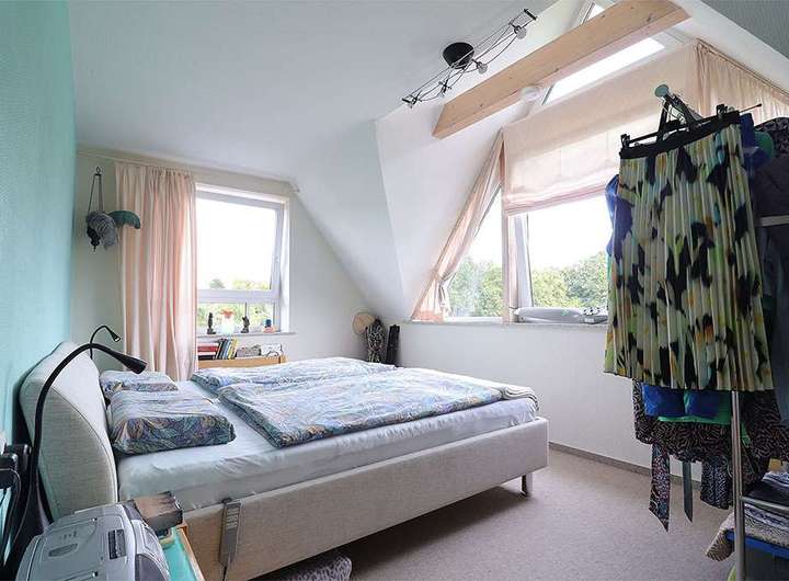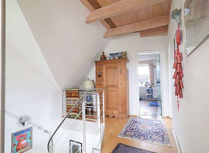 Im Dachgeschoss befindet sich eine helle Galerie. Darüber hinaus stehen ein Schlafzimmer mit direktem Zugang zur Ankleide, ein weiteres Schlafzimmer, ein Tageslichtbad mit Badewanne und Duschkabine sowie ein Arbeitszimmer mit Blick in den Garten zur Verfügung.
