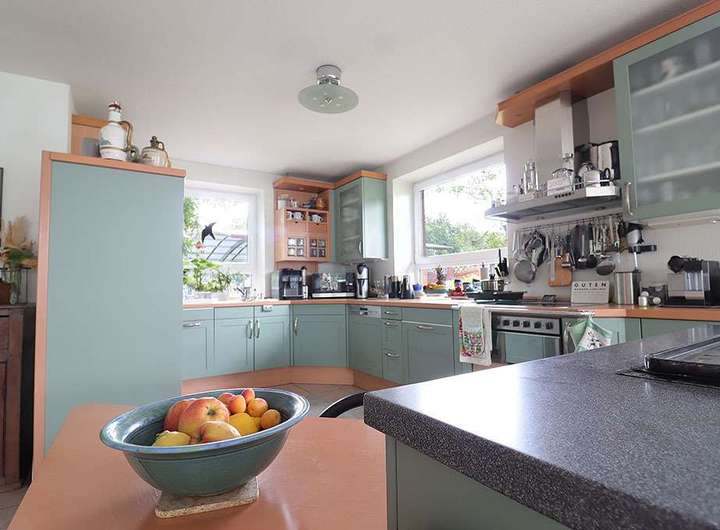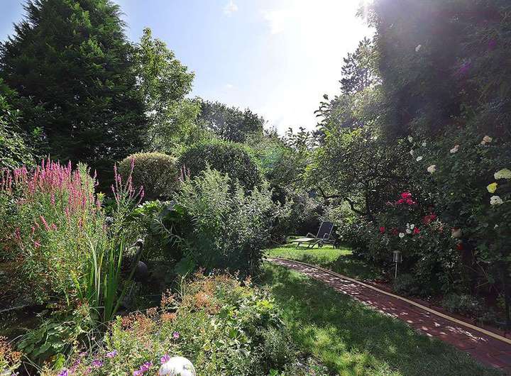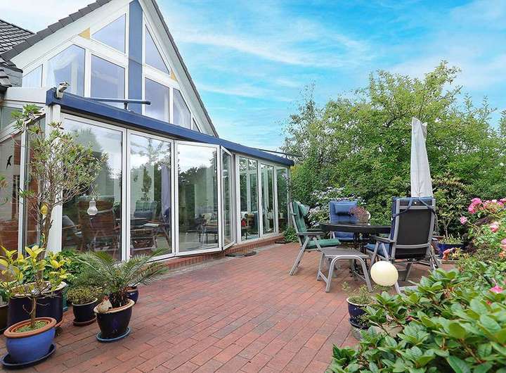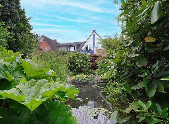 Der Außenbereich wurde mit viel Liebe zum Detail gestaltet: Eine großzügige Terrasse bietet einen weiten Blick in den gepflegten Garten, der durch einen stilvoll angelegten Koikarpfenteich ergänzt wird.