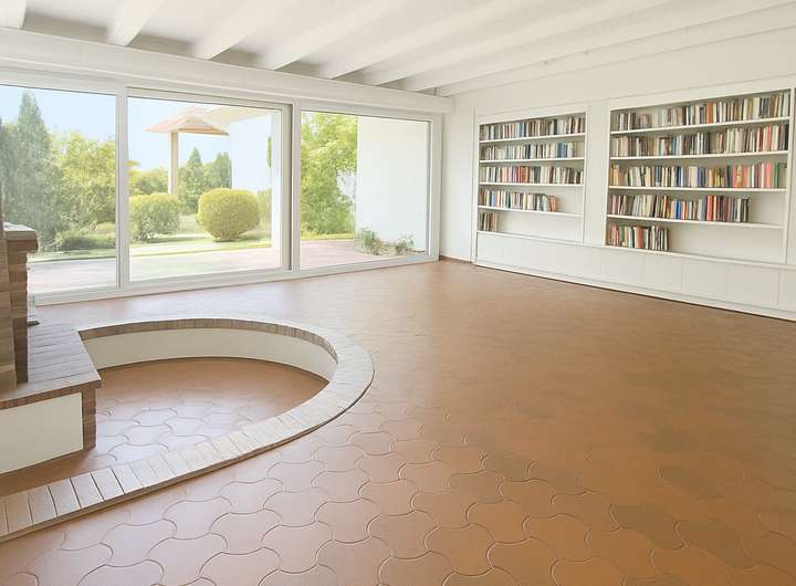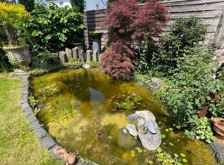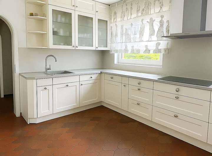 Beim Betreten der Hauptwohnung im Erdgeschoss empfängt Sie ein großzügiges Raumambiente mit lichtdurchfluteten Räumen, warmen Terracotta-Böden und großen Fensterfronten, die den Blick ins Grüne öffnen. Neben der offenen Küche befindet sich der angrenzende, großzügige Wohnbereich mit offenem Kamin, der in den Wintermonaten für behagliche Wärme und gemütliche Stunden sorgt. Von hier aus gelangen Sie direkt auf die sonnige, weitläufige Terrasse mit Sonnenmarkise und in den liebevoll und botanisch angelegten Garten mit einem kleinen Teich – ein echtes Highlight für Naturliebhaber.