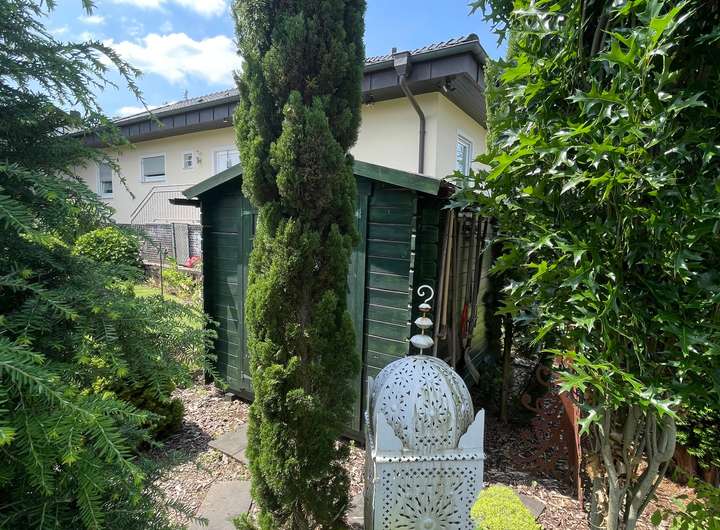 Ein separates, geräumiges Gartenhaus bietet auf dem Grundstück zudem praktischen Stauraum für Gartengeräte und Zubehör.