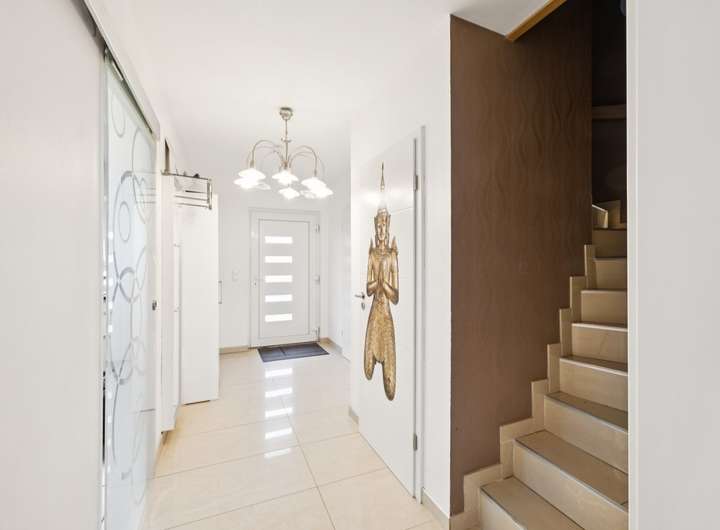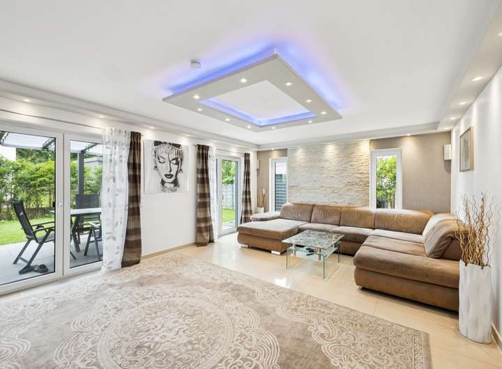 Beim Betreten des Hauses empfängt Sie ein einladender Eingangsbereich, der direkt in den großzügigen Wohnbereich führt. Eine Fußbodenheizung sorgt für behagliche Wärme im ganzen Haus. Die offene Gestaltung des Wohnzimmers bietet viel Platz für individuelle Einrichtungsideen und führt direkt auf die Terrasse, die sich ideal für entspannte Stunden im Freien eignet. Der angrenzende Garten bietet zusätzlichen Raum für Freizeitaktivitäten und Erholung.