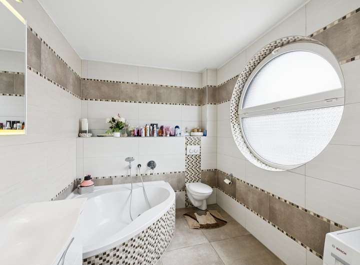 Ein stilvoll gestaltetes Badezimmer mit Wellness-Dusche und Badewanne bietet einen besonderen Komfort.
