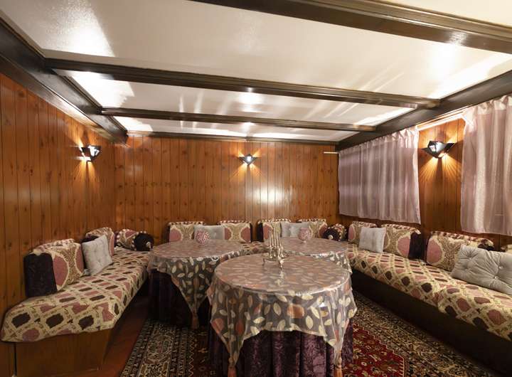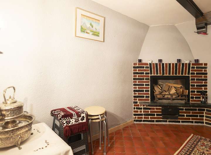 Das Kaminzimmer, vollständig in Holz vertäfelt, mit Sitzbänken ringsum und einem gemauerten Kamin, ist eine wahre Familienlounge – perfekt für gesellige Abende, Feste oder stille Stunden am Feuer.