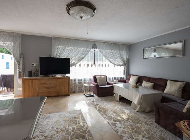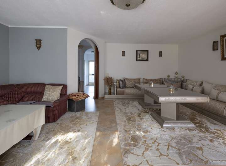 Das Wohnzimmer ist großzügig geschnitten und öffnet sich über eine breite Fensterfront zur Sonnenterrasse und dem Garten. Hier fällt das Licht weit in den Raum, während helle Böden und eine klare Raumaufteilung eine warme, einladende Atmosphäre schaffen.