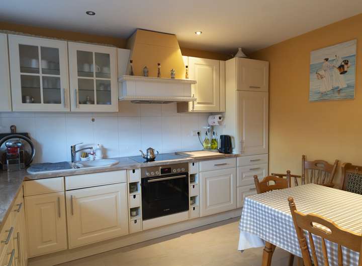 Die Küche präsentiert sich mit klassisch-zeitloser Ausstattung und Platz für den Familientisch – ein Raum, in dem gekocht, gelacht und erzählt wird.