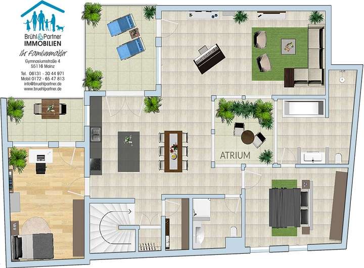 Die Haupteinheit - Atrium-/Loftwohnung - bietet ca 167 m² mit Terrasse, Balkon und dem Atrium (Mittelterrasse) gibt es 3 Orte an der frischen Luft.