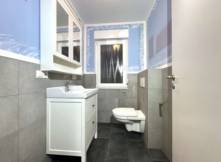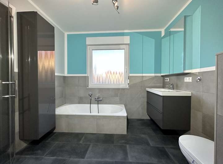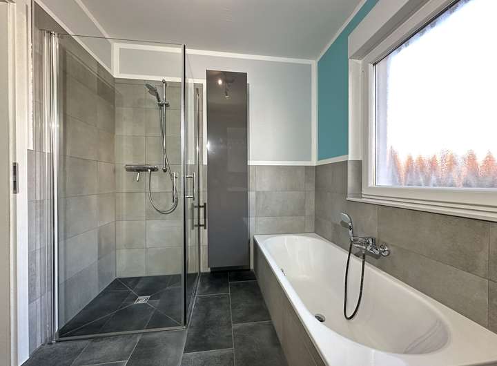 Das Badezimmer ist modern in grau gefliest und mit einer Badewanne und einer bodengleichen Dusche ausgestattet.