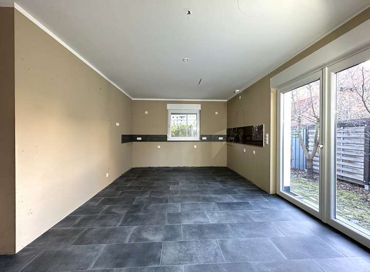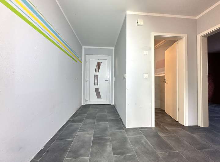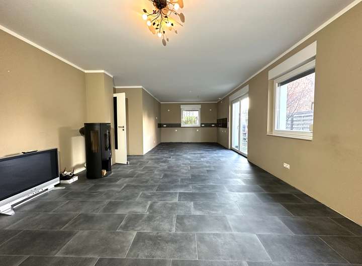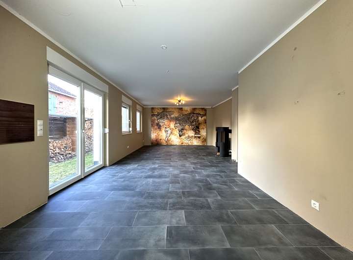 Die Aufteilung des Hauses ist durchdacht und modern gestaltet. Im Flurbereich ist ausreichend Platz für Schuhschrank und Garderobe, außerdem befindet sich hier das Gäste-WC. Geradeaus gelangt man in den ca. 38 m² großen Wohn- / Ess- und Kochbereich. Der Kaminofen sorgt im Winter für gemütliche Momente und kuschlige Wärme. Von hier aus gelangt man über eine große Terrassentür direkt in den Garten.