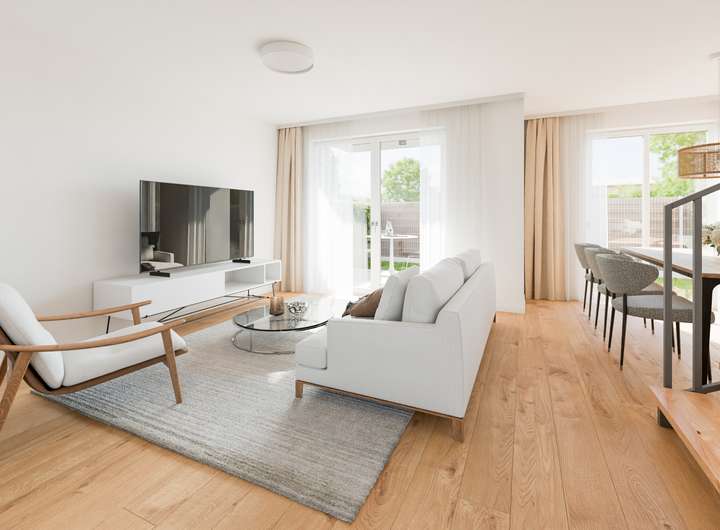 Das Haus kommt gehoben ausgestattet: Eichenparkett, Fußbodenheizung in allen Etagen, hochwertige Sanitärelemente. Noch vorhanden: Mitgestaltungsspielraum bei Bodenbelägen, Badelementen, Wandgestaltungen/Grundriss — so wird das Haus zum persönlichen Zuhause.