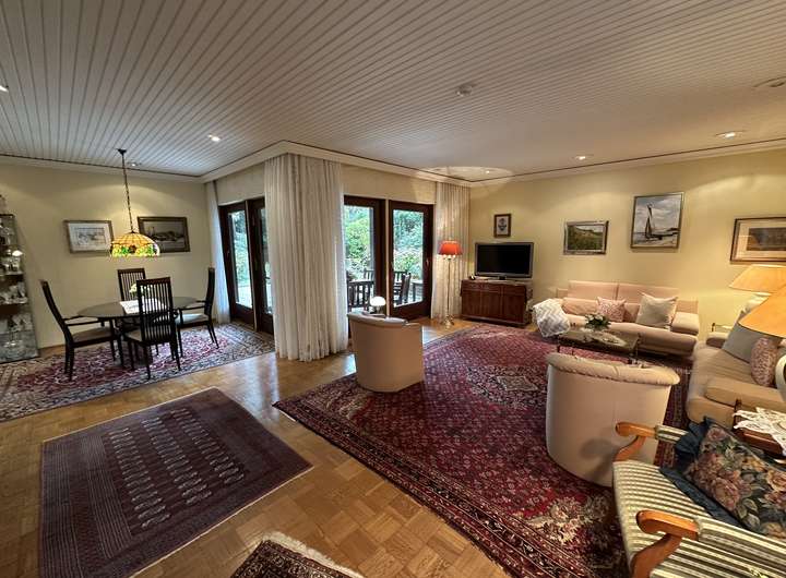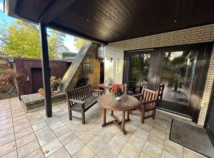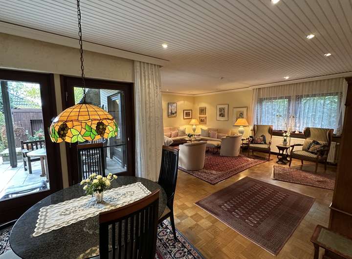 Der einladende Wohn- und Essbereich mit Parkettboden hat Zugang zur teilweise überdachten Terrasse mit Kamin. Der herrliche Blick in das naturnahe, bewaldete Grundstück – ein Ort zum Entspannen und Genießen.