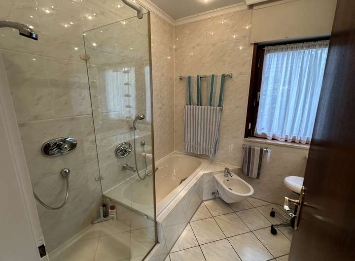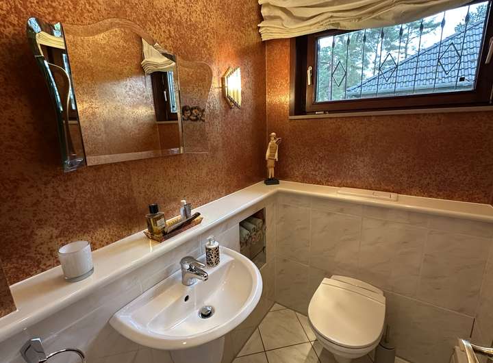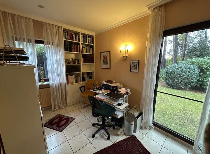 Der Home-Office-Bereich beruhigt beim Blick auf den rückwärtigen Teil des Grundstücks. Neben dem modernen, großzügigen Badezimmer mit Wanne, Dusche und Bidet ist das Gäste –WC - beide mit Fenster ein Highlight.