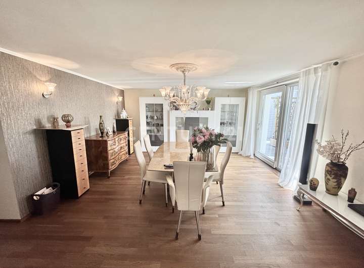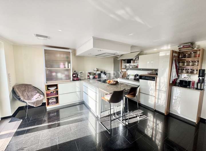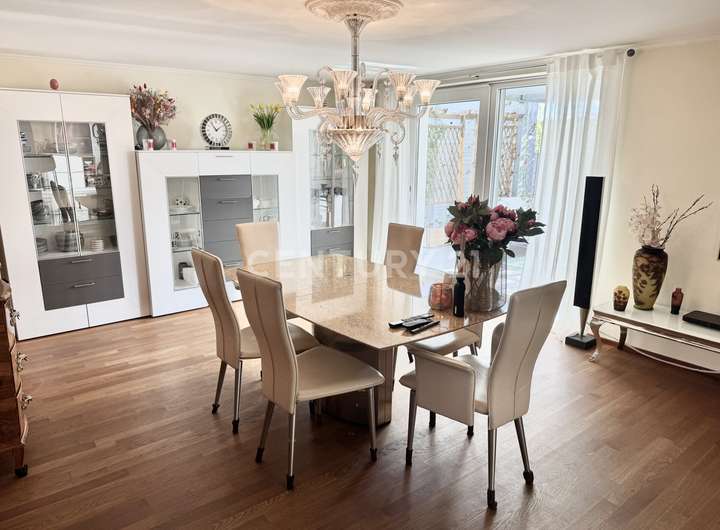 Im Untergeschoss befinden sich ein gemütliches Gästezimmer mit eigenem Bad, die hochwertige Küche (zzgl. 20.000 €) sowie das angrenzende Esszimmer, beide mit direktem Zugang zu den Terrassen.