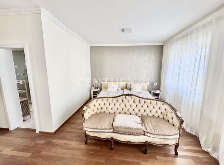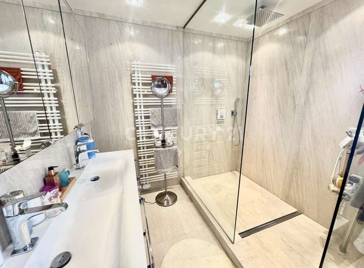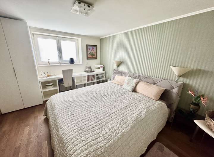 Ein stilvolles Arbeitszimmer, ein Schlafzimmer mit maßgefertigtem 5,70 Meter langem Einbauschrank (Schreinerarbeit zzgl. 8.000 €) sowie direktem Zugang zum modernen Bad mit Dusche und Doppelwaschbecken runden das Raumangebot ab. Für zusätzlichen Komfort sorgt ein separater Ankleideraum – ein kleines Paradies für die Dame des Hauses.