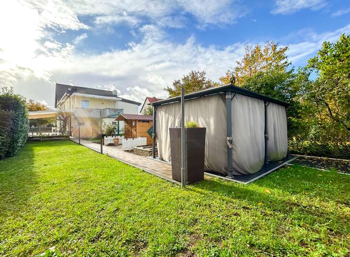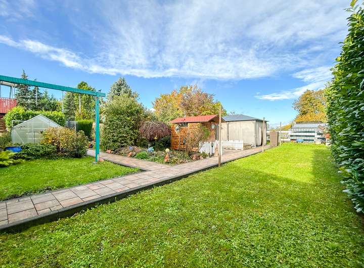 Der liebevoll angelegte ebenerdige Garten ist ein Highlight für Familien: Hier können Kinder sicher spielen, während die Eltern auf der überdachten Lounge entspannen. Ein Doppelcarport, eine Gartenhütte, eine Grillplatzmöglichkeit und eine Bewässerungsanlage machen den Garten zu einem echten Wohlfühlort, perfekt für sommerliche Feste oder gemütliche Nachmittage.