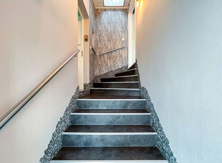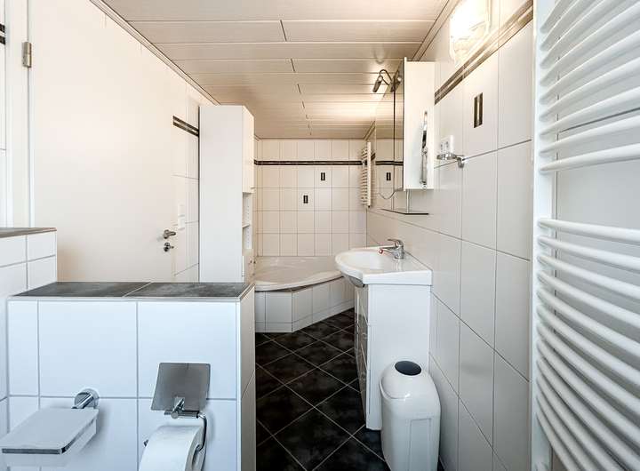 Vom Eingangsbereich führen einige Stufen in den Flur. Gleich angrenzend befindet sich das Tageslichtbad, ausgestattet mit WC, Badewanne, einem stilvollen Handwaschbecken und Handtuchheizkörper – ein perfekter Ort, um morgens entspannt in den Tag zu starten.