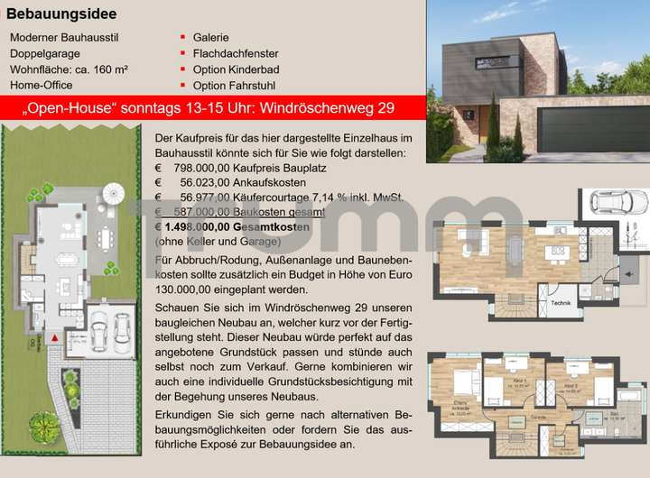 In unserer Eigenschaft als Bauträger mit fast 50-jähriger Erfahrung haben wir Ihnen eine Bebauungsidee mit einem Einzelhaus im Bauhausstil zu dem Grundstück projektiert, wie wir es für Sie auch erstellen könnten. Ein fast fertiggestelltes Haus dieser Art könnten Sie gleich in der Nachbarschaft zum Baugrundstück besichtigen.
