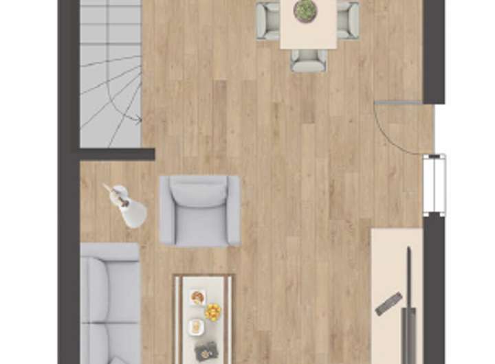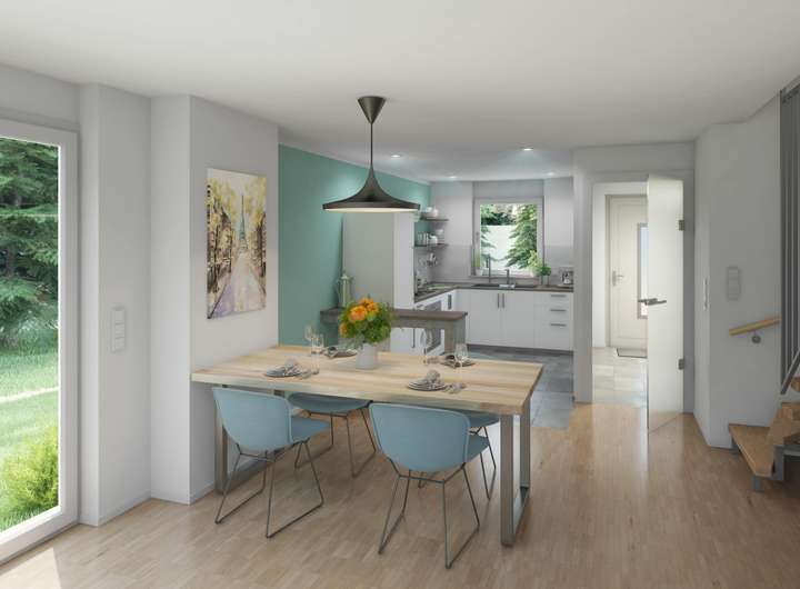 Im Erdgeschoss öffnet sich der großzügige Wohn- und Essbereich mit direktem Zugang zum eigenen Garten. Die offen gestaltete Küche mit angrenzender Speisekammer schafft einen kommunikativen Mittelpunkt des Hauses, während ein Gäste-WC und eine praktische Diele den Wohnkomfort ergänzen.