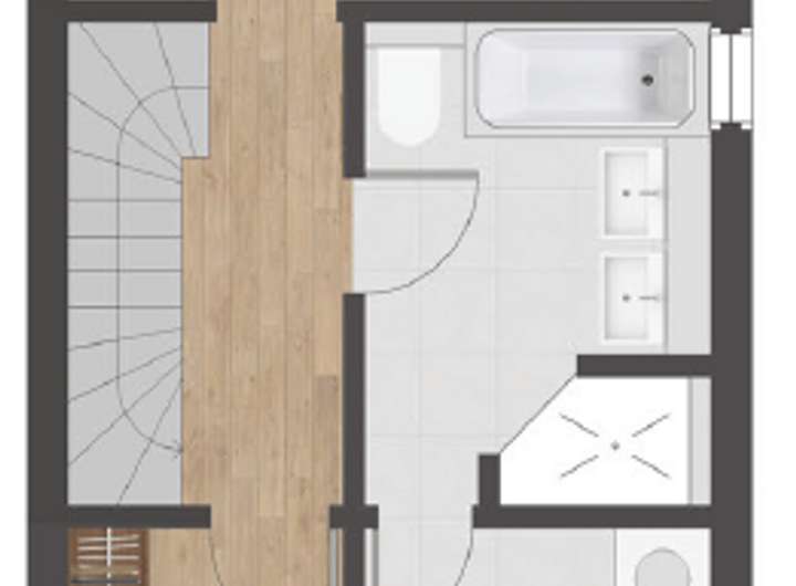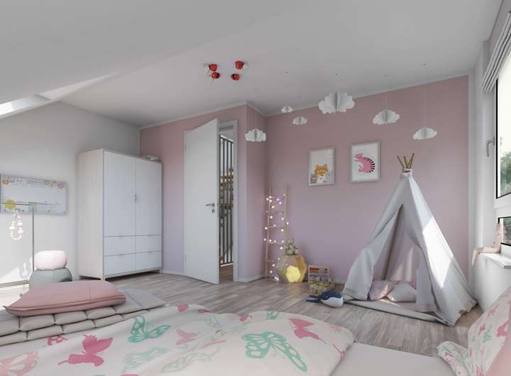 Im Obergeschoss befinden sich ein geräumiges Schlafzimmer, ein Kinderzimmer, ein modernes Badezimmer mit Badewanne und bodengleicher Dusche sowie ein Hauswirtschaftsraum. Das Dachgeschoss bietet mit zwei weiteren Zimmern Platz für ein Büro, ein Gästezimmer oder zusätzliche Kinderzimmer.