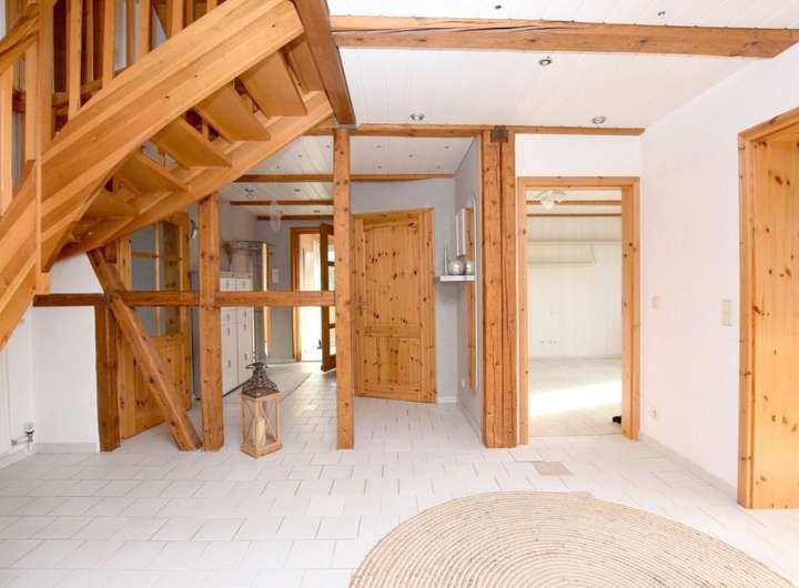 Charaktervolle Sichtbalken und Fachwerkelemente verleihen dem Haus eine gemütliche Atmosphäre und verbinden traditionellen Charme mit modernem Wohnkomfort. Der große Garten mit Terrasse lädt zum Entspannen, Gärtnern oder geselligen Beisammensein im Freien ein. Abgerundet wird das Angebot durch eine Doppelgarage, eine großzügige Gerätehalle sowie einen Teilkeller, der zusätzlichen Stauraum bietet. Ob als Einfamilienhaus mit viel Platz oder als Zweifamilienhaus mit getrennten Bereichen – diese Immobilie bietet Ihnen viele Möglichkeiten, Ihre Wohnideen zu verwirklichen. Gerne zeigen wir Ihnen das Objekt bei einer Besichtigung.
