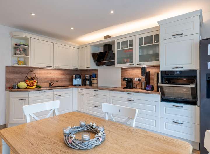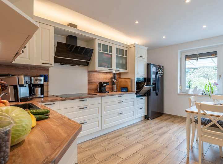 Der Mittelpunkt des Wohnbereichs ist die moderne Einbauküche mit Neff-Einbauherd (2021) und großem Side-by-Side Kühlschrank, direkt angrenzend an den beheizten Wintergarten, der zu jeder Jahreszeit als erweiterter Wohnraum genutzt werden kann.