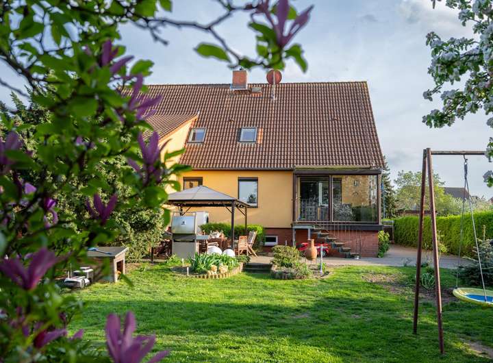 Das Grundstück umfasst ca. 1.200 m² mit einem geschützten Gartenbereich hinter dem Haus - ideal für Familien, Gäste oder entspannte Stunden im Grünen.